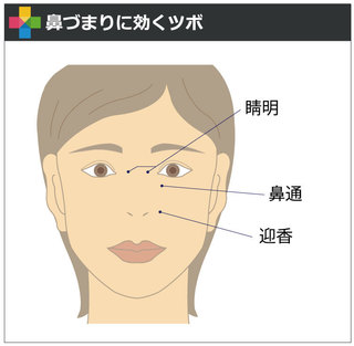 鼻の左右にあり、鼻の長さの真ん中あたりのくぼみにあるツボ。指の腹でやや強めに押します。