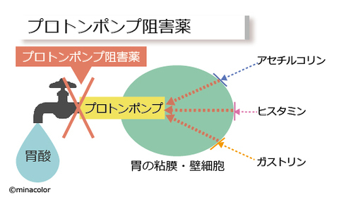 プロトンポンプ阻害薬は、胃粘膜の細胞内でプロトンポンプに先回りして作用し、アセチルコリン、ヒスタミン、ガストリンによる働きをなくしてしまう薬です。