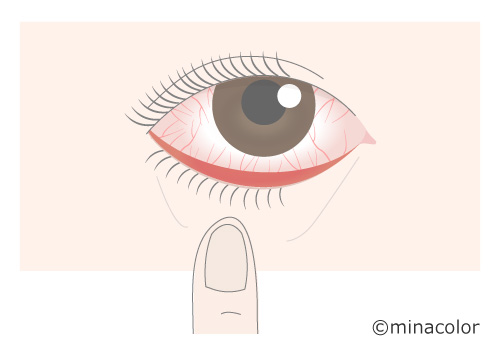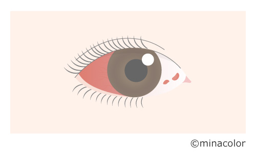 白目(結膜)全体が網目状に赤色になり、まぶたの裏側も充血することがあります。