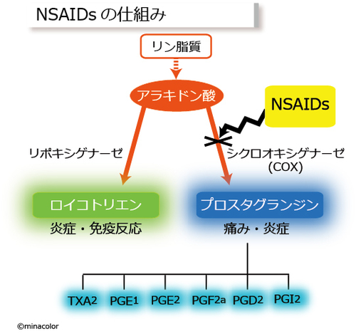 体内で痛みや炎症などを引き起こすプロスタグランジン(PG)の生成を抑えるよう作用するもので、処方薬から市販薬まで幅広く活用されています。