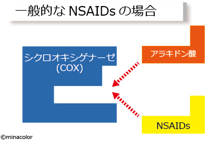 従来のNSAIDsはすべてのCOX阻害に関わるものがほとんどですが、成分によってはCOX-1に強く働きかける、反対にCOX-2に強く働きかけるなど特徴があります。