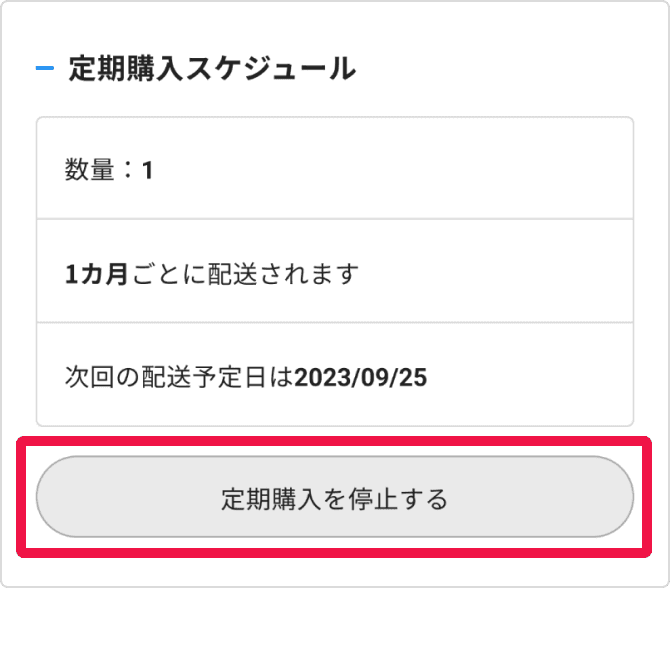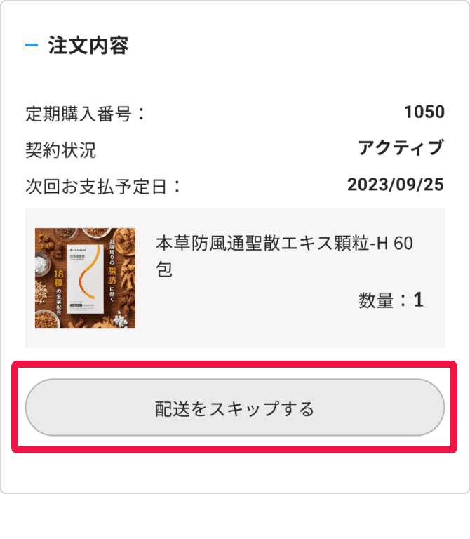 定期購入商品は、発送予定日の前日までスキップ配送(定期購入商品の次回配送の後ろ倒し)が利用できます。