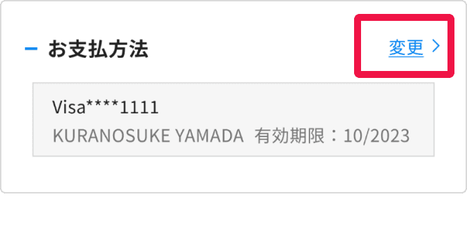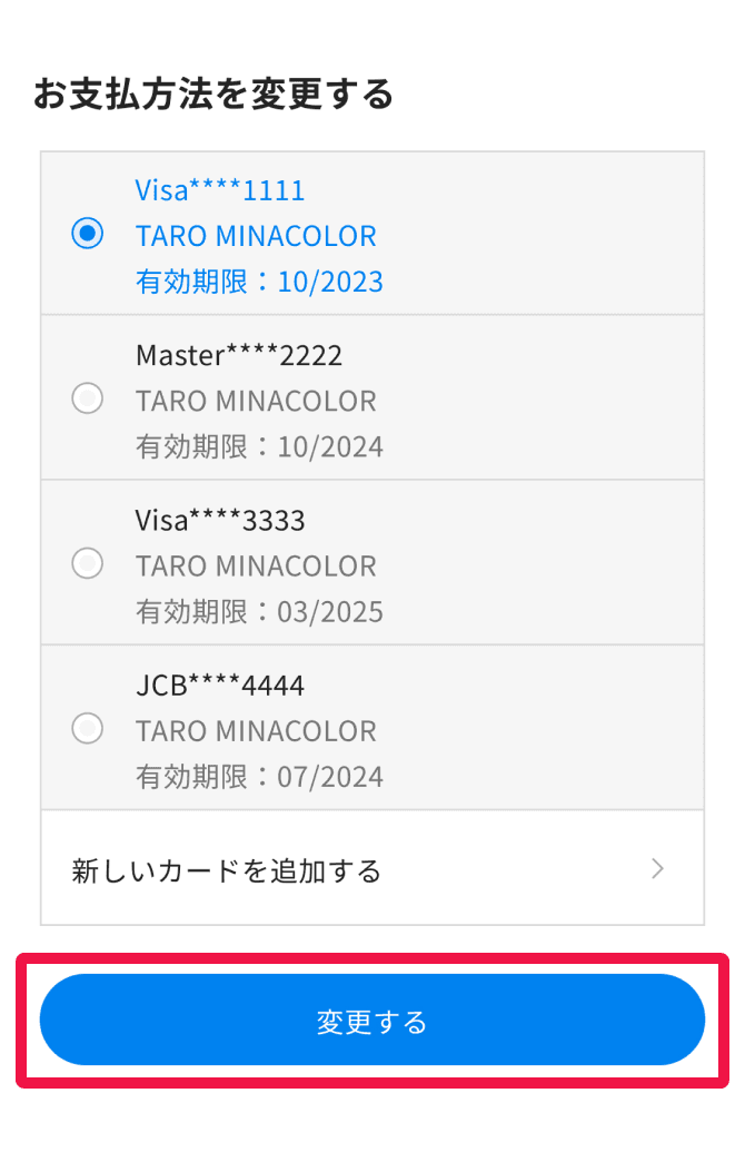 3.登録済みのお支払い方法を選択するか新しいカードを追加し、「変更する」を選択