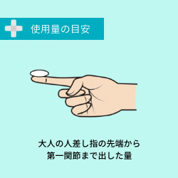 患部の直径が約6cmの場合、人差し指の第一関節ぐらい(約2cm)を手にとり、患部よりやや広めに塗り広げます。手のひら(約8cm程度)に広げるぐらいのイメージです。
